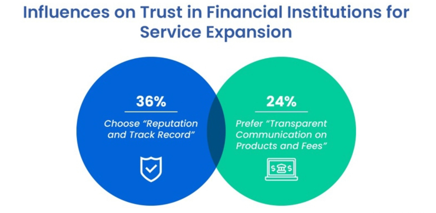“Financial institutions should focus marketing on their track record when looking to cross-sell products. […] When asked about the factors that influence respondents’ level of trust in their financial institution when considering purchasing additional services, the top choice was ‘Reputation and track record,’ selected by 36% of respondents, followed by ‘transparent communication about products and fees’ noted by 24%.”