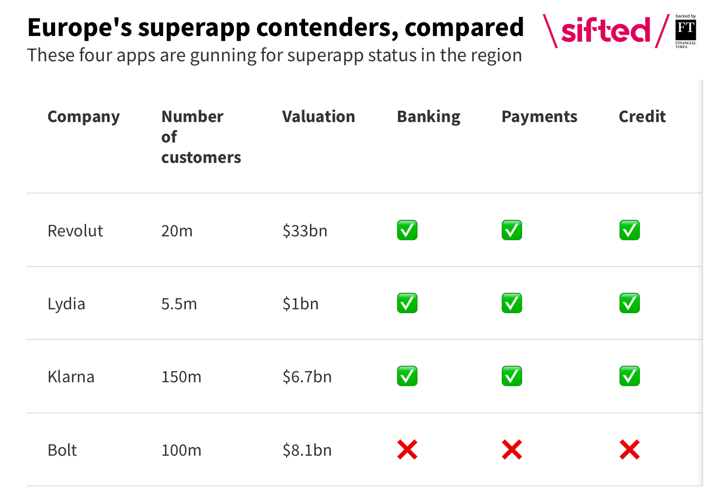“Investors tell Sifted that they expect the end of the race to a superapp in Europe to look more like a relay — with separate financial, mobility and commerce superapps rather than one multi-sector app that consumers never have to leave. The neobanks got there first. But at the same time, by the point that Revolut, Klarna and Bolt arrived on the scene, ecommerce in Europe was already dominated by Amazon, and mobility was dominated by Uber.”